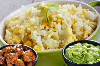 - Serve the rice in a bowl and add the guacamole, chicken and corn