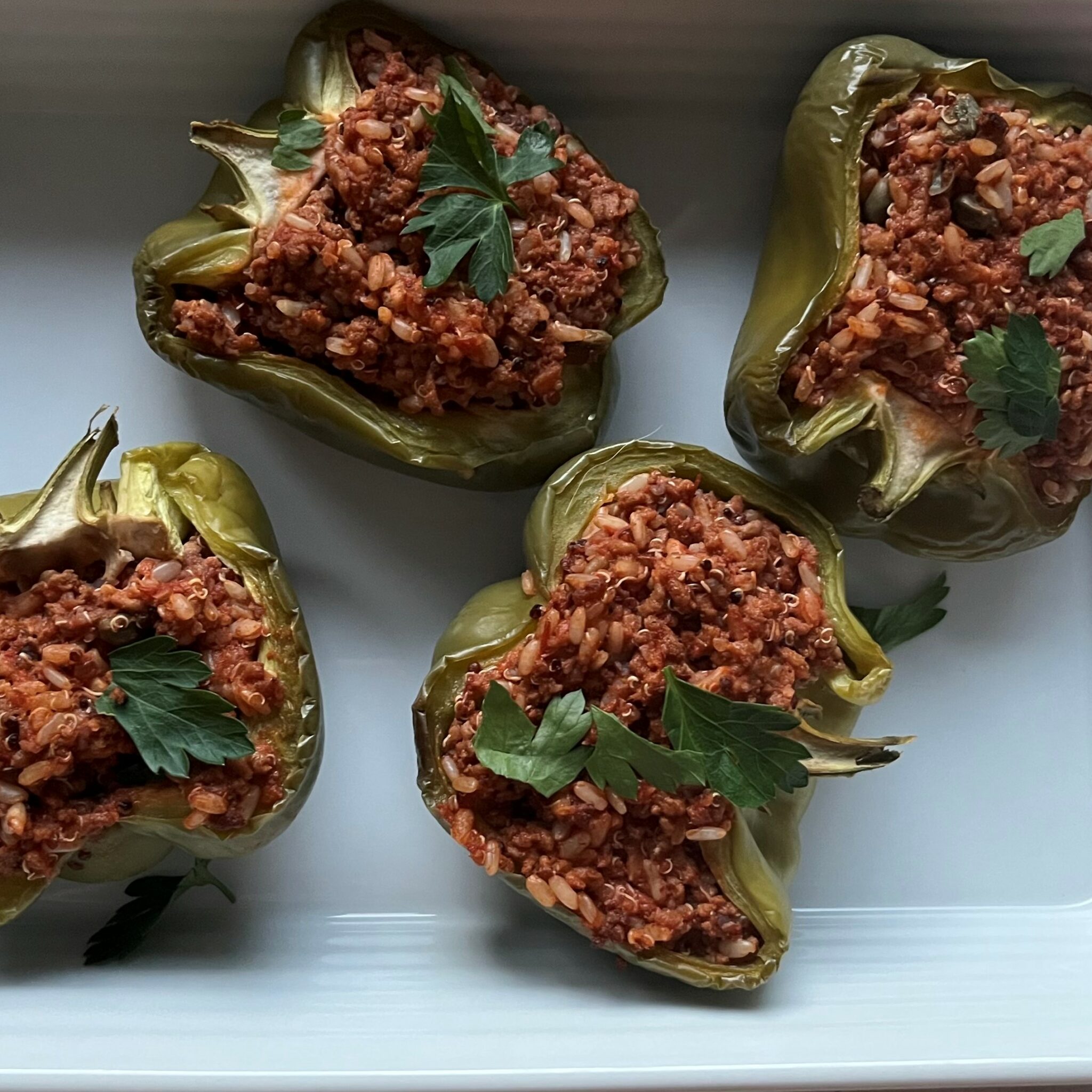 These hearty stuffed capsicums are an easy and balanced mid-week meal. Lauren suggests serving them with a fresh green salad or roasted vegetables. Ingredients: Method: