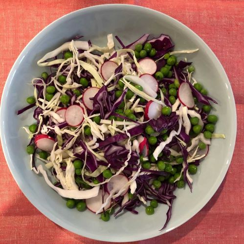 Ingredients (serves 4): For salad For dressing Cook the peas in boiling water as per packet instructions (don’t over-cook). When cooked, drain and run under cold water to stop them from cooking. As finely as you can, slice the red and green cabbages. Slice the radishes into rounds and finely grate the parmesan. Combine all the dressing ingredients and whisk thoroughly. Put all the vegetables into a serving bowl, add the dressing, toss and serve immediately. Recipe provided by Gabi Massey, MSK staff member.